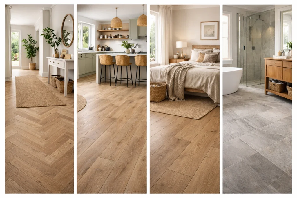 Laminate can still work in dry bedrooms or lower-risk areas where budget matters, but it is not usually the safest choice for wet entrances or hard-working kitchen-living zones.
