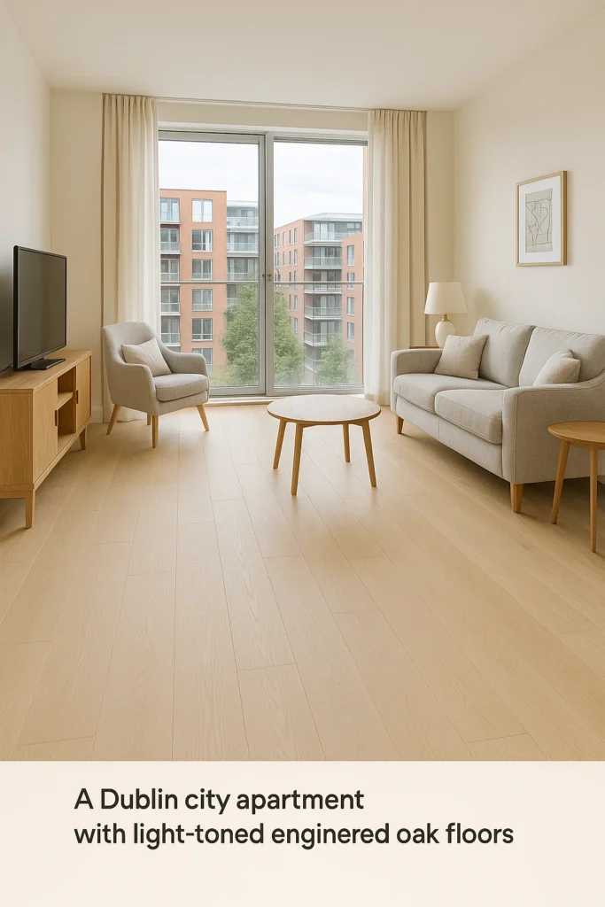 Engineered wood has become Dublin’s most popular alternative to solid timber. Made of multiple layers topped with real wood veneer, it provides the look of hardwood while being more stable in changing climates. For apartments in Sandyford, Docklands, or Tallaght, engineered oak is often the go-to option.