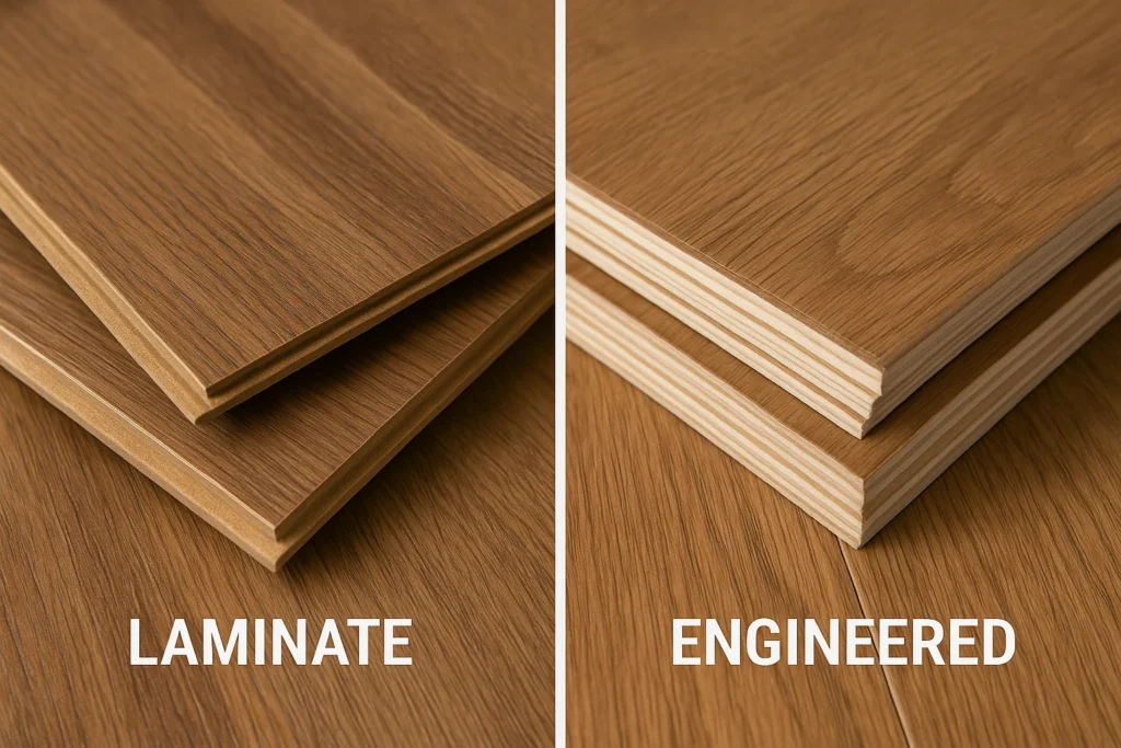 Engineered wood offers authenticity and resale value, while laminate is cheaper and more resistant to scratches.