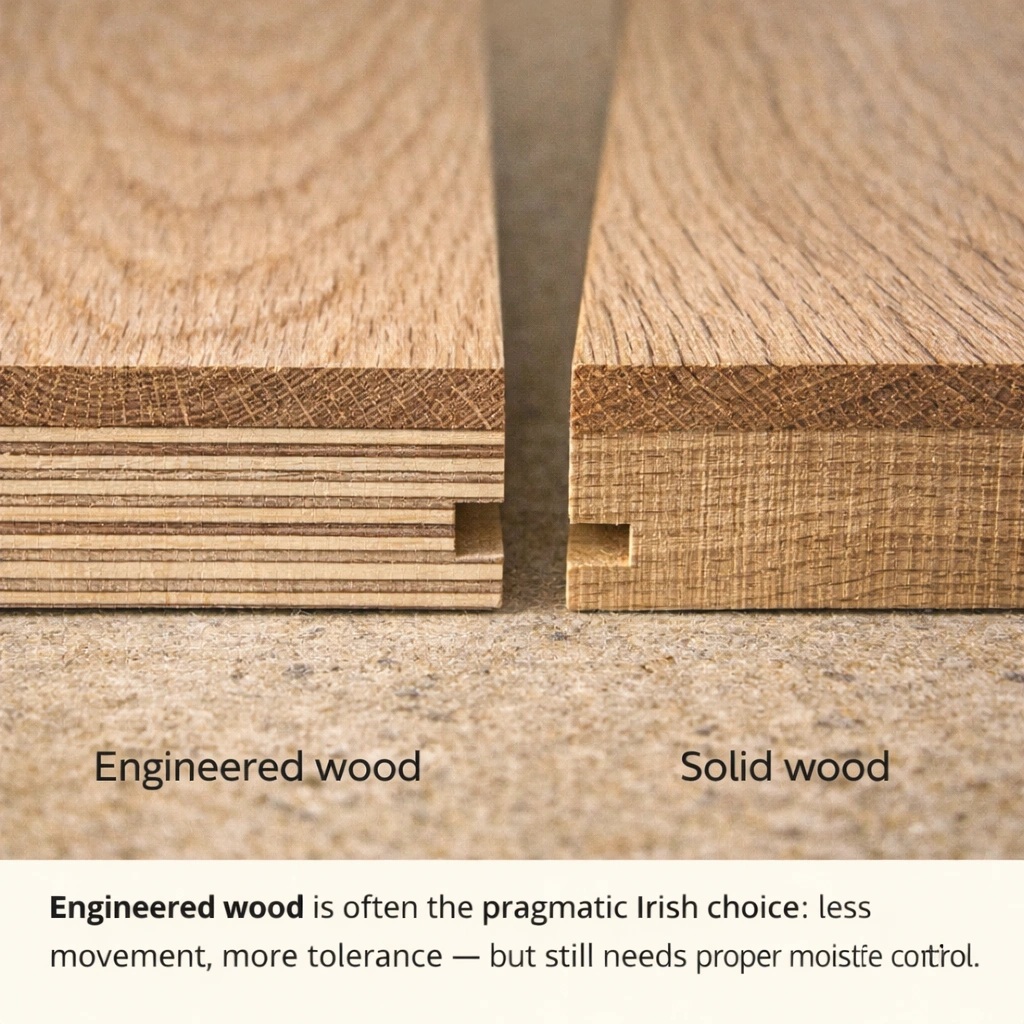 In Irish new builds, the key flooring constraint is usually residual moisture in screeds and radon membrane detailing. In period homes, the key constraint is often ventilation and movement in suspended timber floors, plus unevenness. Choosing flooring without identifying the subfloor type is like choosing tyres without knowing whether you’re driving on tarmac, gravel, or bog road.