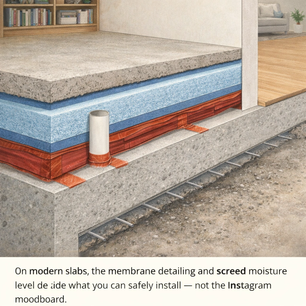 - Impermeable finishes (some vinyl systems, certain coatings) can be fine on a modern slab if moisture levels are proven, but risky on an older “breathing” build-up unless you redesign the whole system.