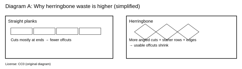 Waste is higher in herringbone because the pattern creates more offcuts, starter rows get sacrificed to keep lines true, and awkward rooms force extra trimming. Straight planks can “run” with fewer cuts; herringbone cannot. Expect your supplier to ask about the room shape for a reason.
