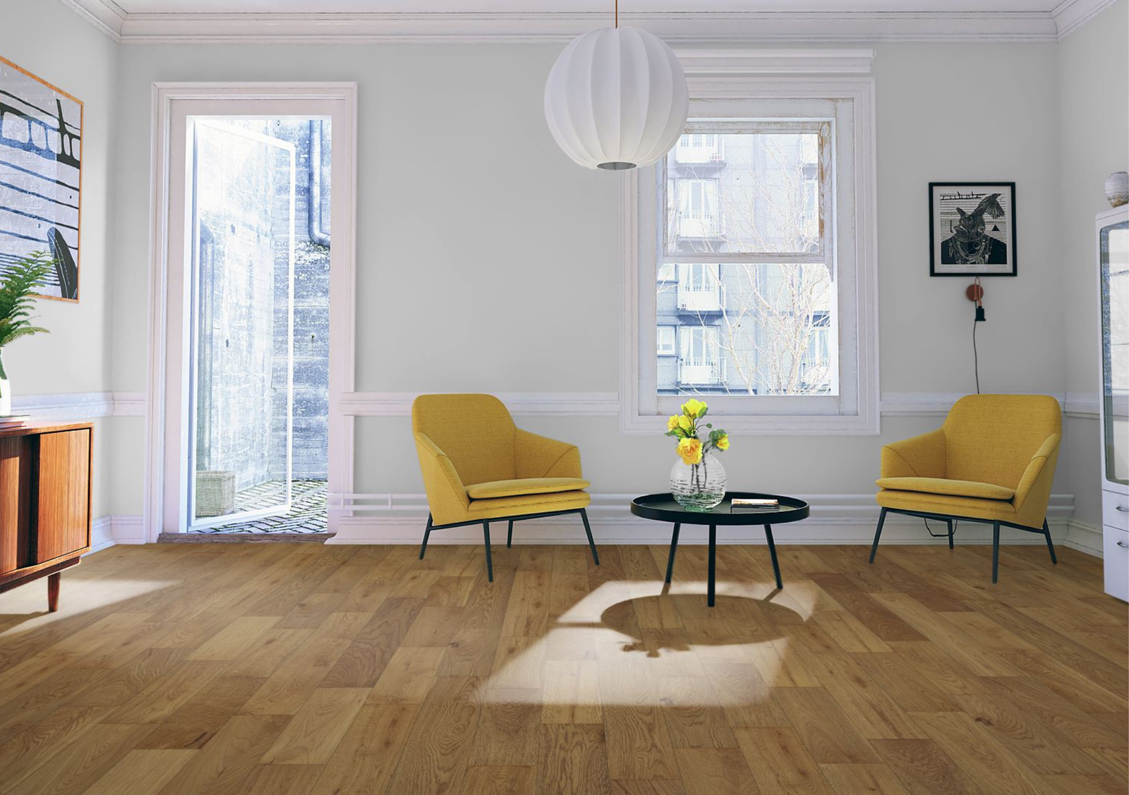 Harvest Oak 150 engineered wood flooring from the Lignum Strata range features rich, rustic oak tones inspired by the warmth of the harvest season. Its natural colour variation creates a cosy, homely atmosphere, while the expressive grain patterns running through each board add depth and traditional character. Finished with multiple layers of brushed matt lacquer, the surface enhances texture while offering durable, low-maintenance protection.